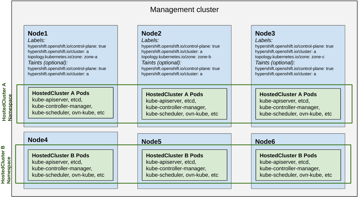 HyperShift enables implementing the strategy to colocate and isolate pods for Hosted Clusters. As a management cluster operator you can leverage the following Node labels and taints: